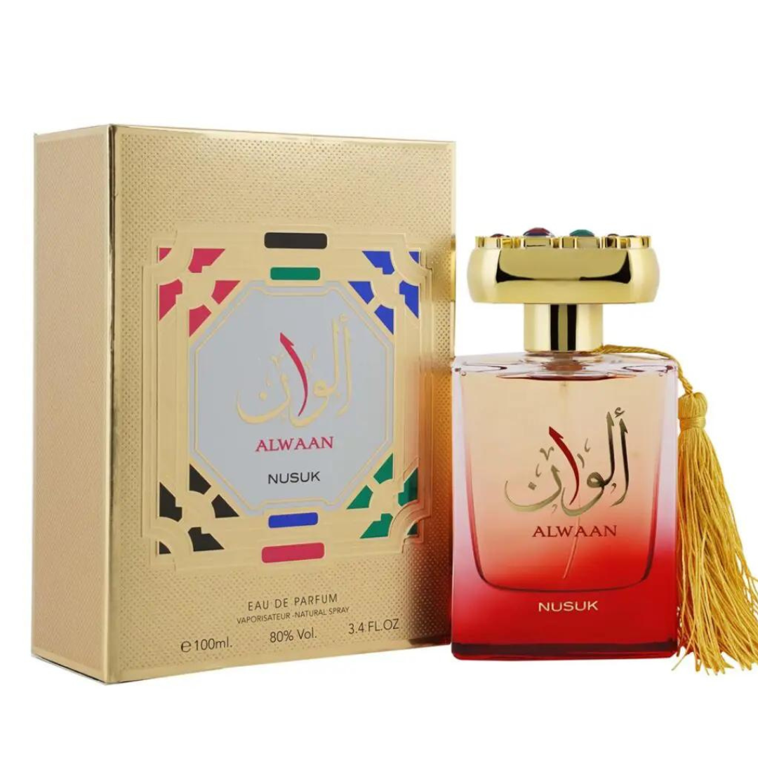 Alwaan este un parfum oriental de la Nusuk, pentru femei. Parfumul începe cu o notă de vârf proaspătă și se transformă într-o bază caldă. Notele de vârf fructate de fructe roșii și bergamotă deschid parfumul.