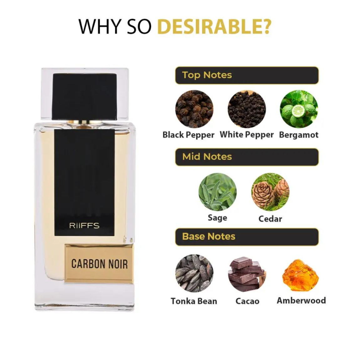 Vă prezentăm Carbon Noir, aroma perfectă pentru bărbatul modern care emană încredere și stil. Această fragranță condimentată cu ambră se deschide cu o explozie de piper negru și alb, combinată cu prospețimea bergamotei. Inima parfumului este o combinație captivantă de salvie și cedru, în timp ce notele de boabe de tonka, cacao și ambră creează o bază caldă și senzuală care rezistă pe tot parcursul zilei. Experimentați farmecul Carbon Noir și lăsați o impresie puternică oriunde mergeți.
