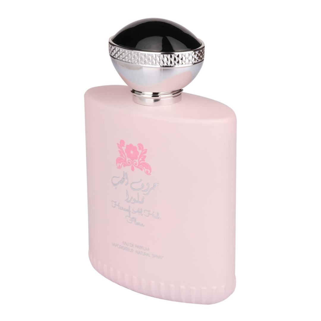 Huroof Al Hub Flora este mai mult decât un parfum - este o experiență florală încântătoare ce te poartă pe aripi de vis printr-o grădină luxuriantă plină cu iasomie, trandafiri, gardenie și flori albe.